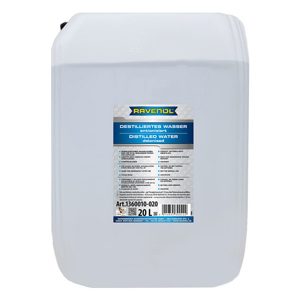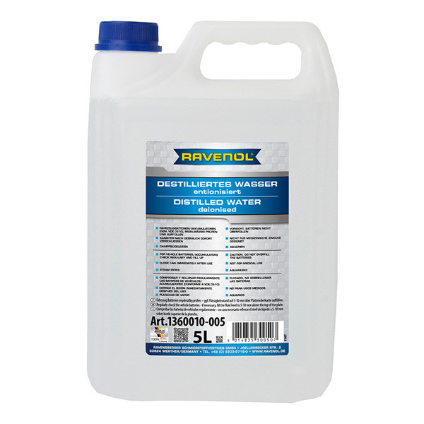 RAVENOL Destilliertes Wasser (entionisiert) - специально приготовленная дистиллированная, деионизированная вода. Не содержит ионов. Соответствует предписаниям VDE. Идеально подходит для всех видов российских и импортных аккумуляторов. Может использоваться в быту для паровых утюгов, аквариумов и т.д.Отличается от обычной дистиллированной воды сверхглубокой очисткой ионообменными смолами.